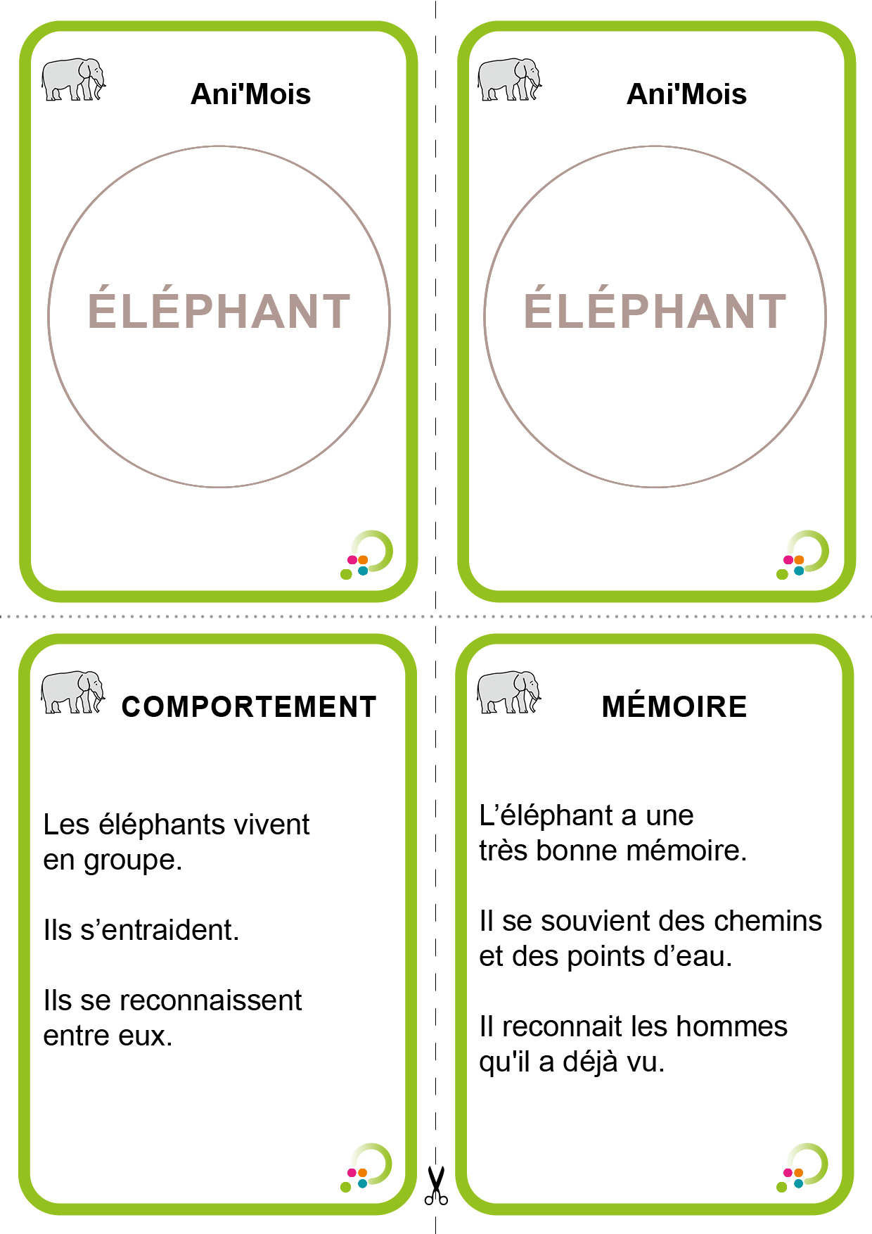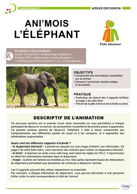 Vous pouvez compléter votre activité avec le diaporama Ani’Mois éléphant et le livret Ani’Mois éléphant (rédigé selon les règles du FALC).