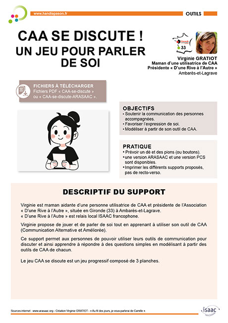 Virginie est maman aidante d’une personne utilisatrice de CAA (Communication Alternative et Améliorée) et présidente de l’Association « D’une Rive à l’Autre », situé en Gironde (33) à Ambarès-et-Lagrave. « D’une Rive à l’Autre » est relais local ISAAC francophone.