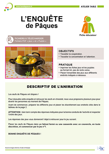 Dans ce jeu, nous proposons plusieurs jeux pour mener une enquête et retrouver les chocolats de Pâques.