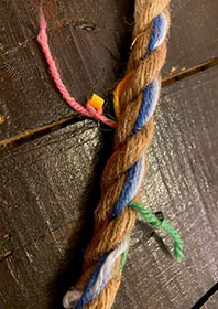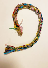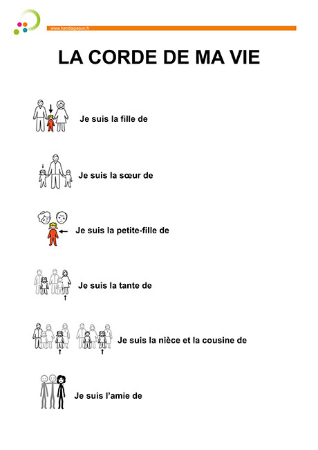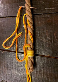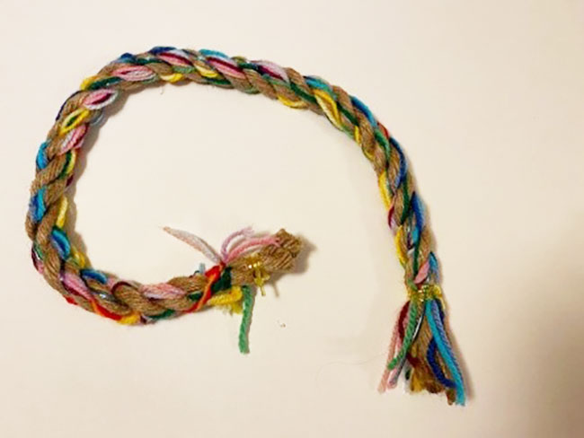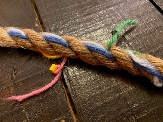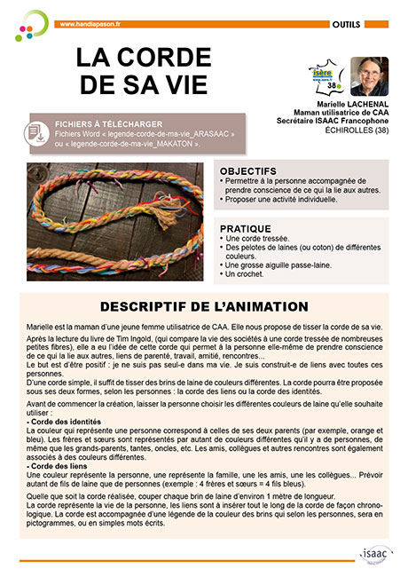Elle propose aux personnes de tisser la corde de leur vie afin de prendre conscience de ce qui les relie aux autres : liens de parenté, relations professionnelles, amitiés, rencontres… Cette activité, à réaliser en individuel, consiste à utiliser une corde simple sur laquelle on vient tisser des brins de laine de couleurs différentes.