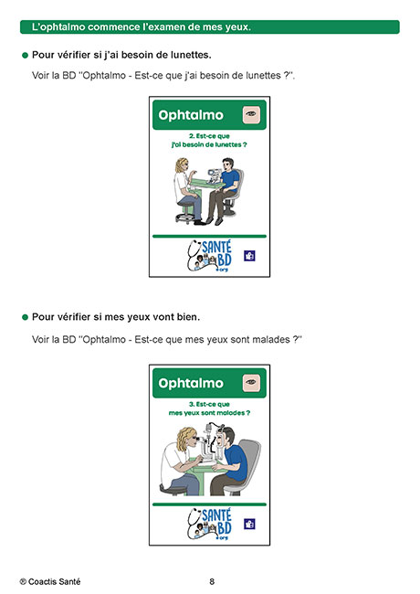 Les ressources disponibles sur santebd.org donnent des explications faciles à comprendre pour savoir comment se déroulent les rendez-vous chez l’ophtalmo et faciliter le dialogue avec des personnes avec une faible littératie en santé.