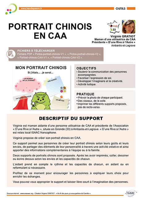 « D’une Rive à l’Autre » est relais local ISAAC francophone. Virginie a créé un support pour créer son portrait chinois.